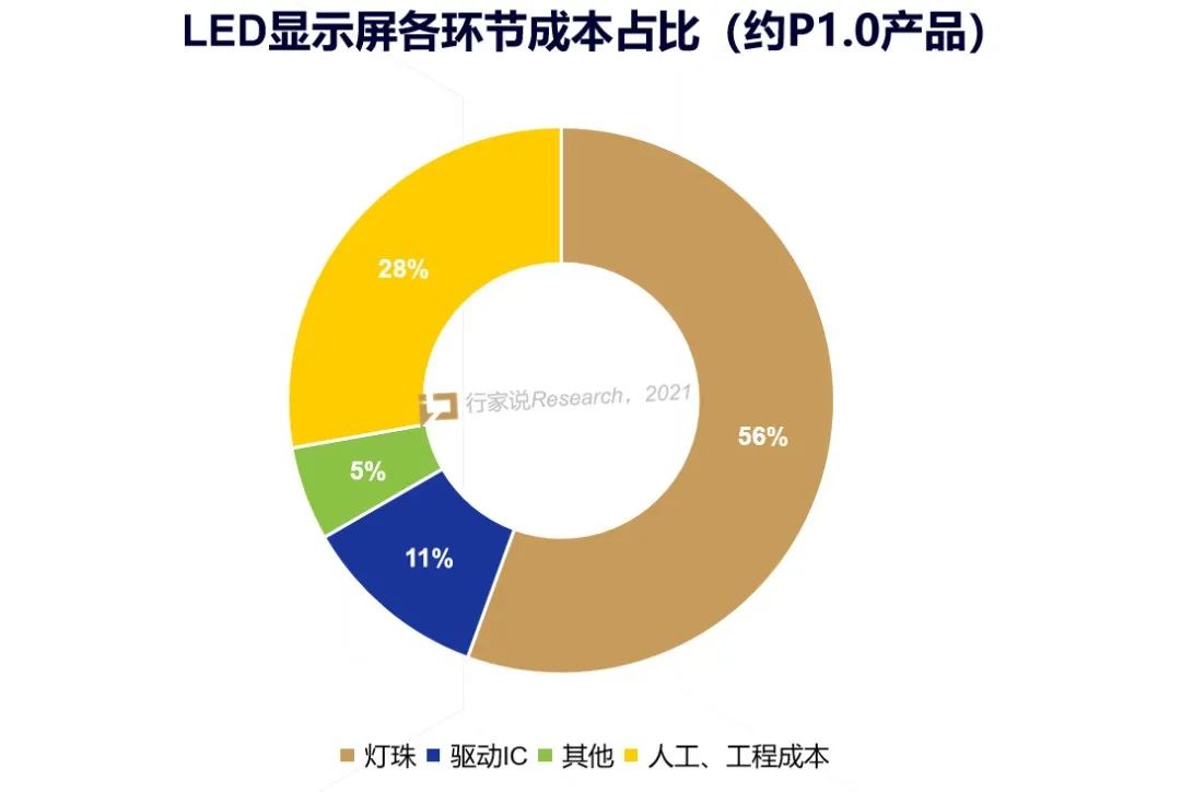 據(jù)行家說產(chǎn)業(yè)研究中心數(shù)據(jù),一塊全彩LED顯示大屏由顯示屏箱體、顯示屏模組、電源等多個部分組成。以顯示微間距約P1.0產(chǎn)品成本為例:LED燈珠在其中所占比例大約為50%;驅(qū)動IC所占比例約為10%;PCB所占比例大約為10%;其他部分為5%;人工/工程成本為25%。而對于P1.0以上的顯示屏產(chǎn)品,LED燈珠占比逐步下降,驅(qū)動IC的占比則會增加。