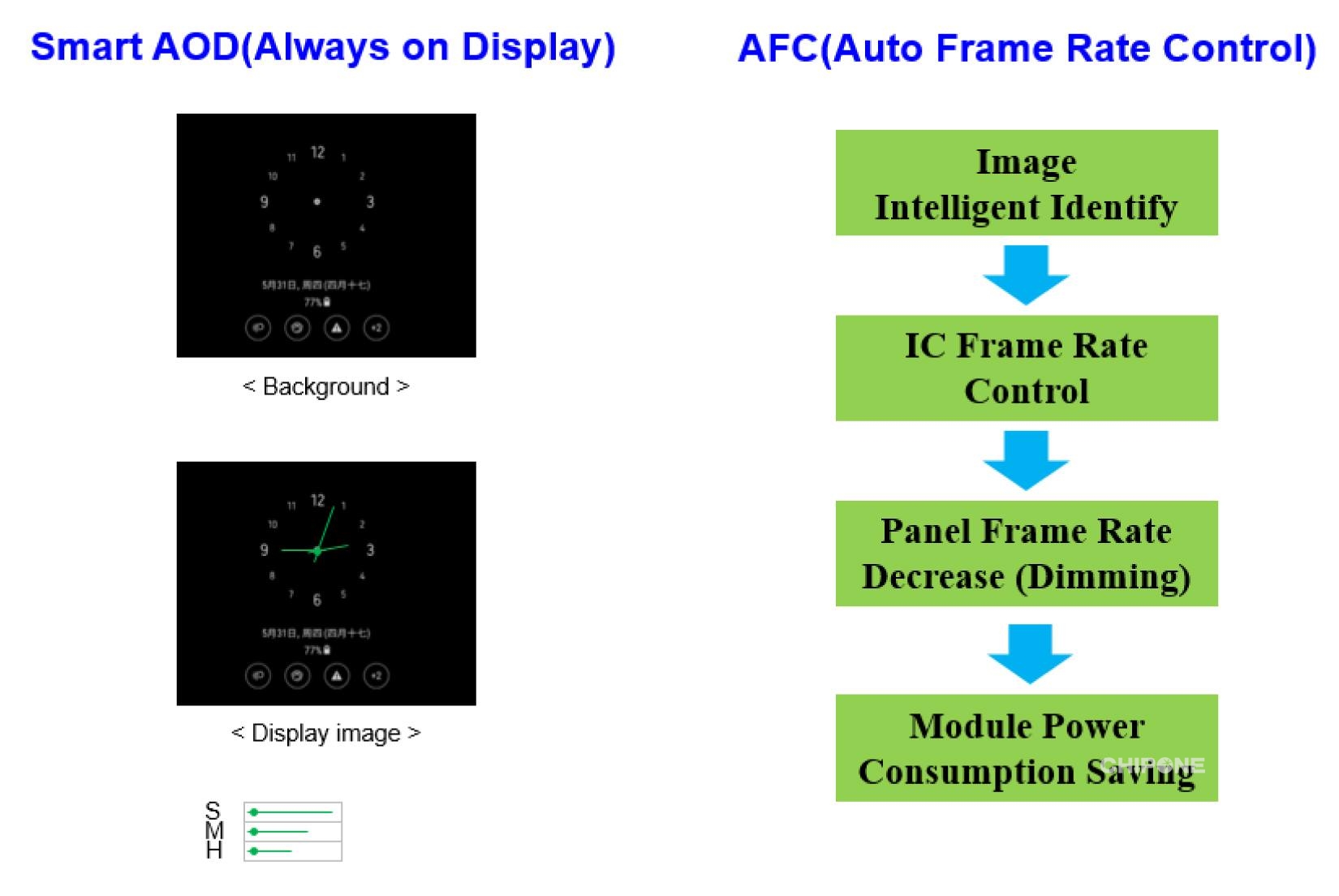 在省電方面,IC還做了特殊的設(shè)計方案,Smart AOD功能使得面板在待機(jī)模式并顯示時鐘時達(dá)到最優(yōu)的省電效果。