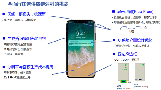 手機(jī)產(chǎn)業(yè)鏈正面臨全新的挑戰(zhàn),包括設(shè)計(jì)、制造以及工藝上的種種難點(diǎn)。具體問(wèn)題如:聽(tīng)筒、前置攝像頭的位置如何重新規(guī)劃,如何解決正面生物識(shí)別的問(wèn)題,如何應(yīng)對(duì)面板因切割率降低而產(chǎn)生的成本問(wèn)題,如何解決異型切割問(wèn)題……凡此種種,是整個(gè)供應(yīng)鏈需要面臨的共同挑戰(zhàn)。