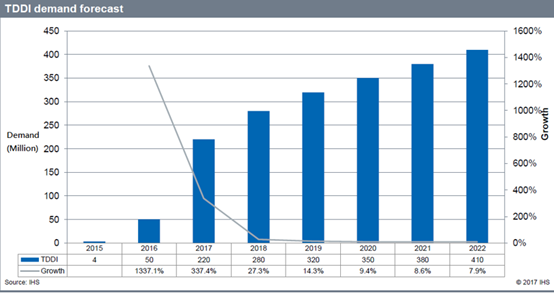 過(guò)去因 TDDI IC 單價(jià)偏高,導(dǎo)致整體 In-Cell 面板模組報(bào)價(jià)居高不下,但隨著面板廠(chǎng)與 IC 設(shè)計(jì)廠(chǎng)商持續(xù)針對(duì)產(chǎn)品進(jìn)行優(yōu)化,TDDI IC 降價(jià)速度加快,也可望加速提升整體 In-Cell 的滲透率。預(yù)計(jì) 2018 年, In-Cell 方案的滲透率將達(dá) 37.6%,其中搭載 TDDI IC 的 In-Cell 產(chǎn)品比重也有機(jī)會(huì)提升至 22%。